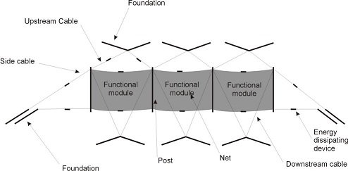 该落石防护套件由两个侧向功能模块和至少一个中央功能模块组成,这意味着至少包含三个拦截结构区域和4根支柱。